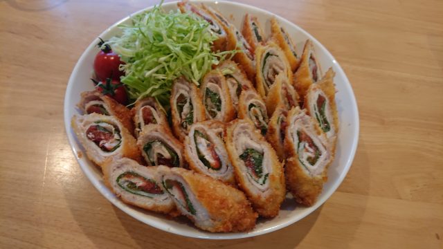 梅干しと大葉を豚肉で巻いてカラッと揚げたやつ。